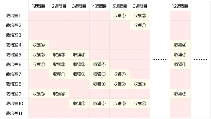 渡辺マッシュルームハウス様は4週間で4回(1週間1サイクル)の周年栽培です。