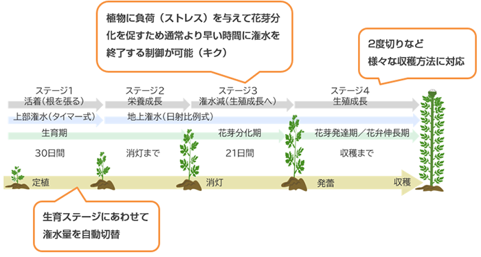 定植から収穫までの生育ステージを4段階に分け、それぞれに適切な潅水を行います。