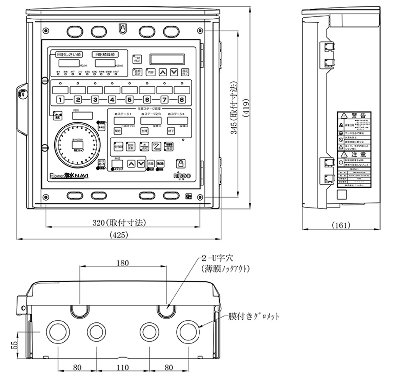 | 入力 | 日射センサ(1点)、流量計(2点) ※入力拡張ボックス(オプション)により、土壌水分またはECを合計8点測定可能 |